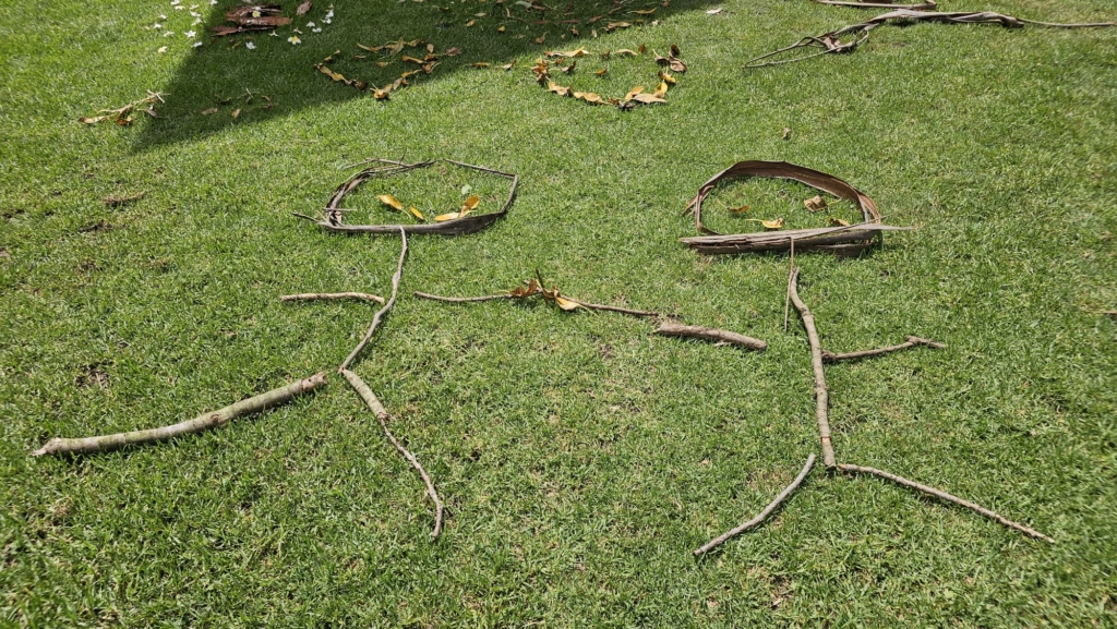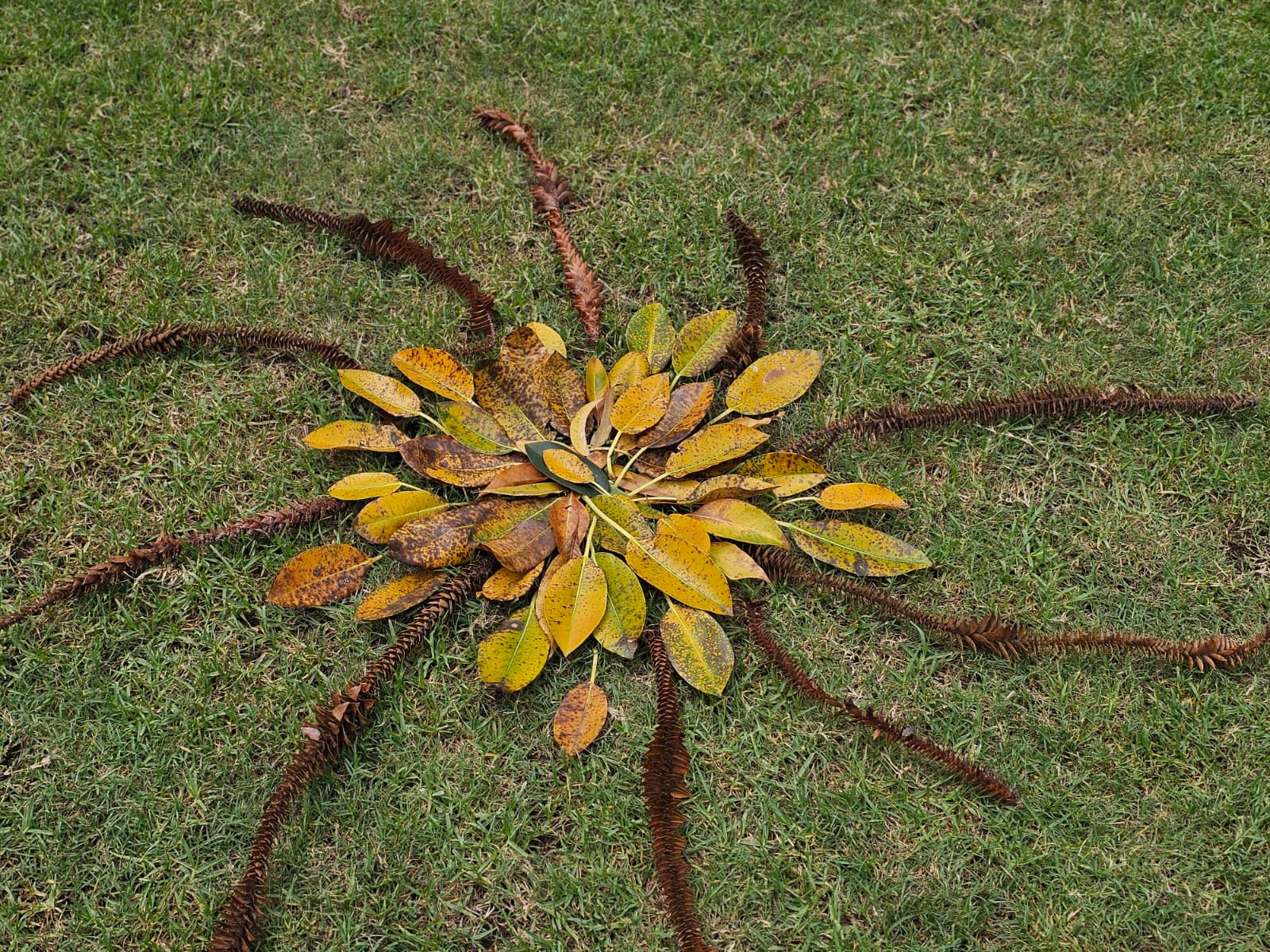 Nature’s debris was repurposed into joined hearts, people holding hands (or a bicycle, depending on perspective), prickly spirals, a fig-leaf sun and a fern frond given a final moment of pre-compost glory.